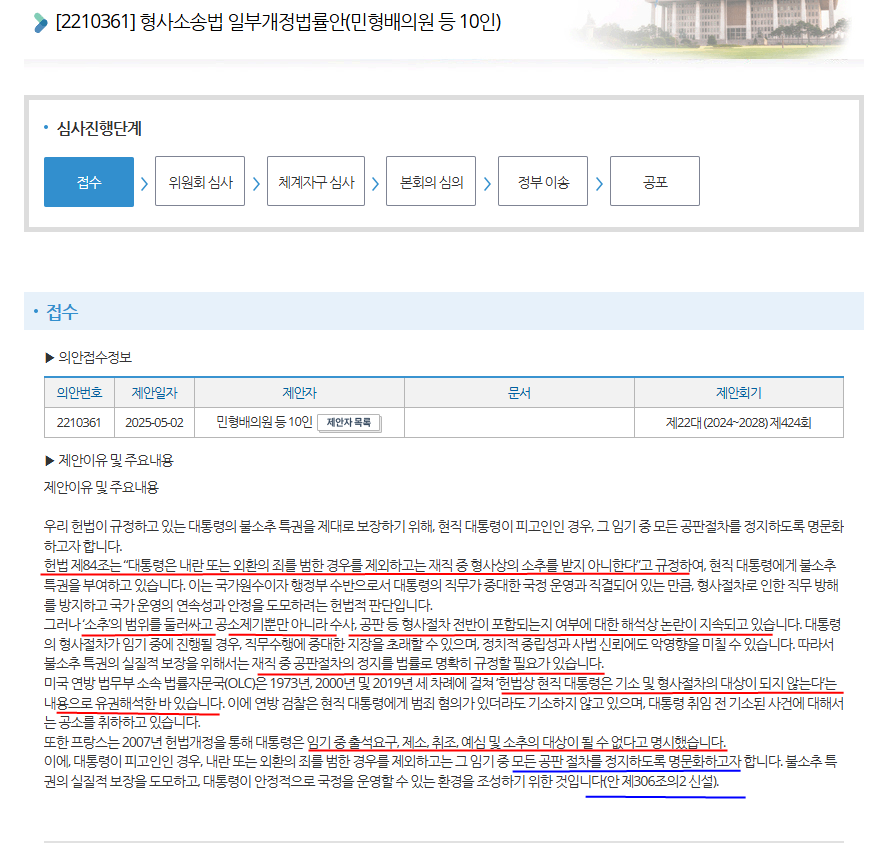 그리고 나서, 현재 '재판중지' 조항인, 형사소송법 제 306조에다 '피고인이 대통령에 당선되면 재판을 중지한다'는 법안을 신설, 발의했다.