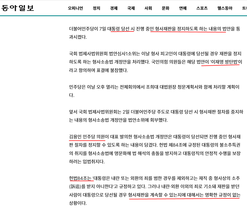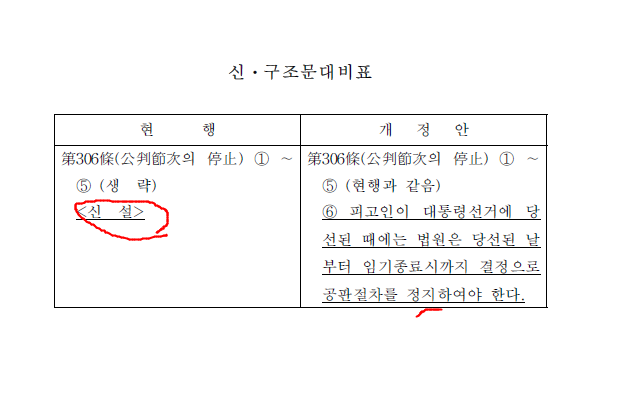 민주당은 자당의 정치적 유리함을 위해, 형사소송법 제 306조에, '대통령 당선시 재판 중지' 조항을 신설한 것이다.