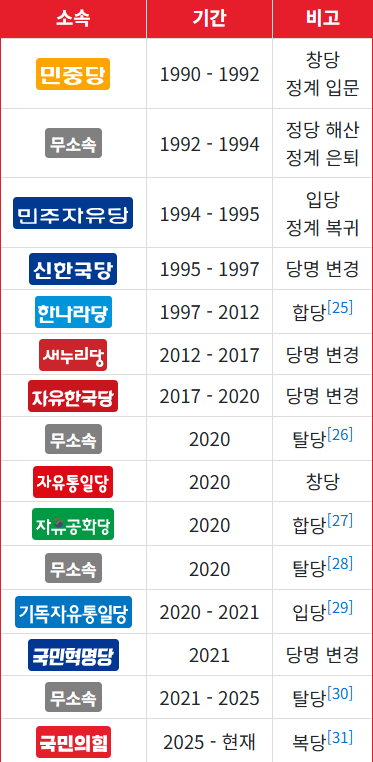 민중당, 민자당, 신한국당, 한나라당, 새누리당, 자유한국당, 자유통일당,자유공화당, 기독자유통일당,국민혁명당,국민의힘