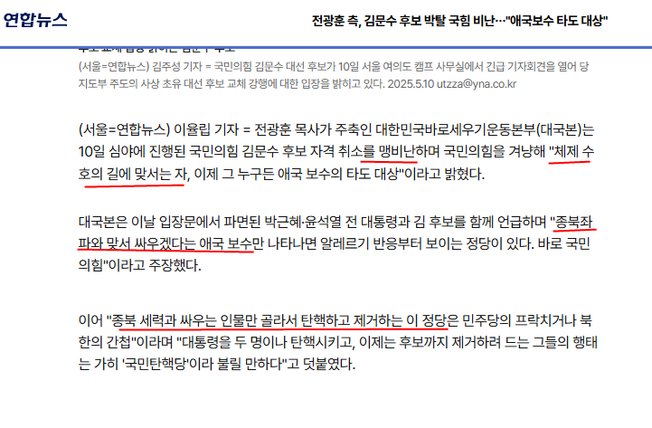 전광훈은 김문수를 축출하려는 국민의힘 주류를 비판하며, 김문수를 '종북좌파를 척결하는 애국세력'으로 추앙했다.