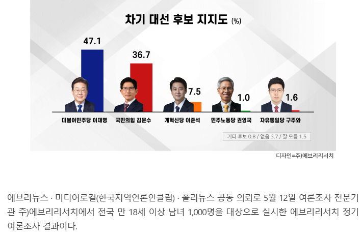 [에브리리서치 여론조사] 이재명 47.1%, 김문수 36.7%, 이준석 7.5%, 구주와 1.6%, 권영국 1.0% 순 - 에브