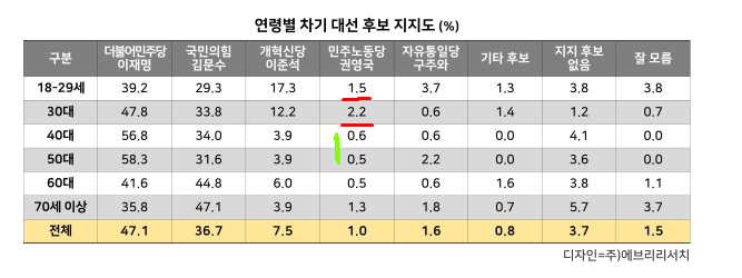 민주노동당 권영국 - 전체1% : 광주 전라 2.2%, 대전충청 1%, 경기인천 1.9%, 서울 0.5%