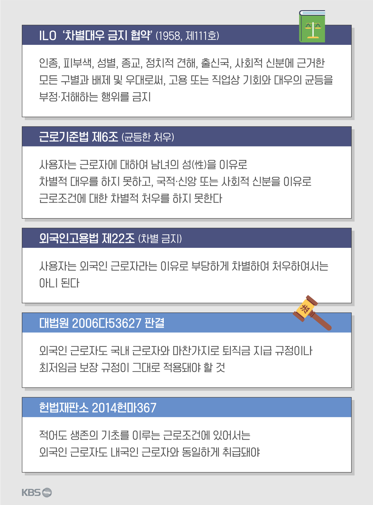 해당 법안이 통과될 경우 우리나라가 1998년에 비준한 국제노동기구(ILO)의 '차별대우 금지 협약'( 1958, 제111호)에 위배되고, 국적에 따른 차별을 금지하는 근로기준법 제6조와 외국인고용법 제22조에도 저촉된다는 점이 현실적 한계로 꼽혔습니다. 내·외국인 차별 없는 대우를 강조한 대법원 판례와 헌법재판소 판단도 있습니다. 외국인이라는 이유로 최저임금을 차등 지급하는 건 현실적으로 어렵다는 말입니다.