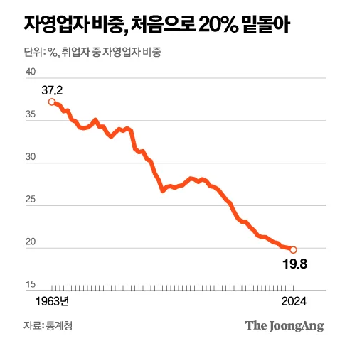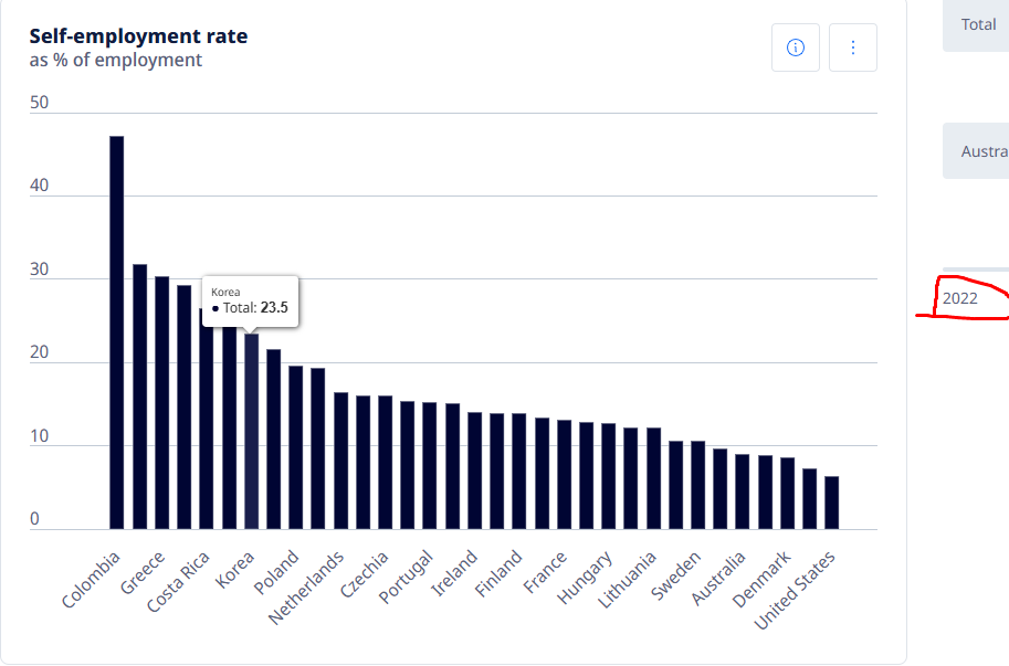 한국 자영업 비율 23.5% ~ 19.8%로 높은 이유, 백종원 인기의 어두운 이면. 직원보다 돈 못벌어도 자영업하는 한국을 바꾸자.