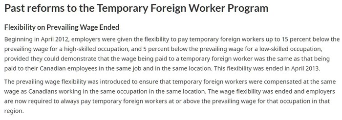 캐나다 정부가 ‘기준임금 유연화’(Flexibility on prevailing wage)라 불렀던 해당 제도는 1년 만인 2013년 4월 공식 폐지됐다.