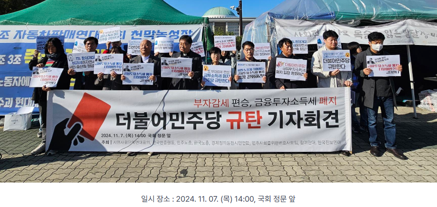 2024년. 11월 7일, 경실련 등, 시민단체는 민주당의 금융투자소득세 폐지를 비판했다. 민주당과 국힘의 합작품이다.
