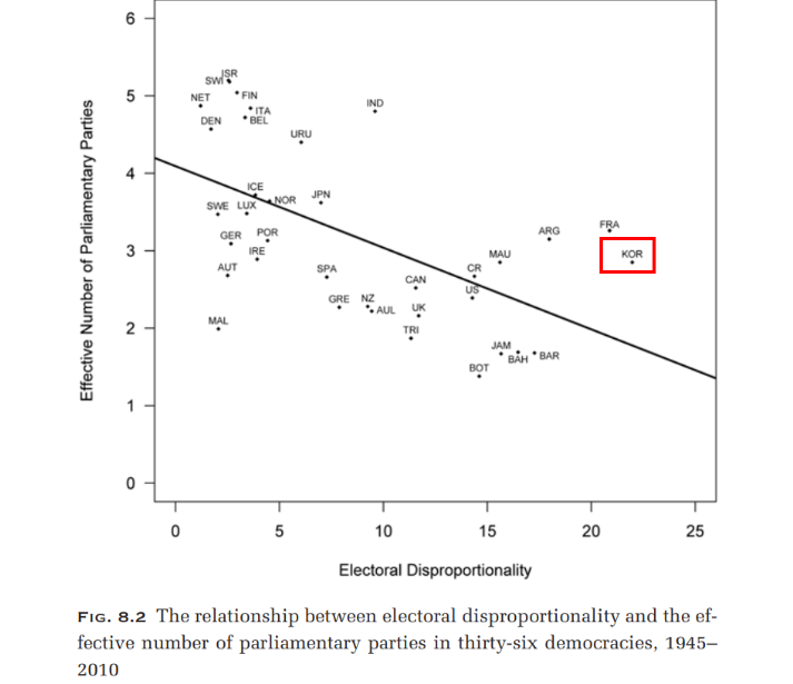 (2) 한국 총선제도 개혁 근거. 유권자 표와 의석 숫자의 비율이 비례하지 않는다. 국회의원 선출 방식이 ‘민심’을 전혀 반영하지 못했다. 비례대표를 늘려야 하는 이유. 선거제도와 선거 불비례성 - 아렌트 라이파트 (네덜란드 정치학자)가 36개국 총선 제도를 분석한 결과이다.