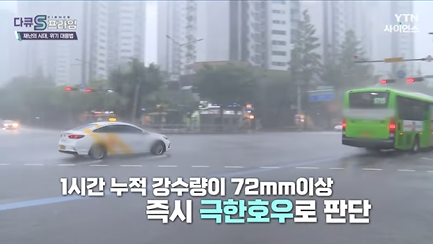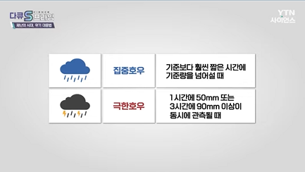 극한 호우, 1시간에 50mm 이상, 또는 3시간에 90mm 이상이 동시에 관측될 때,