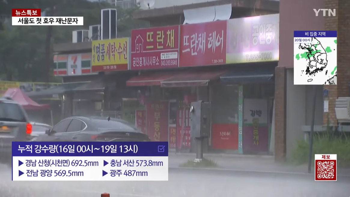 극한 호우 누적 강수량. 경남 산청 (시천면) 692.5 mm, 충남 서산 573.8 mm, 전남 광양 569.5 mm, 광주광역시 487 mm
