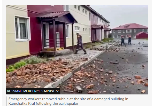 In Russia’s district of Severo-Kurilsk, near the epicenter of the earthquake, a state of emergency was issued after tsunami waves lashed the coast, tearing boats from their moorings and carrying away storage containers, according to state media TASS and videos from the scene.