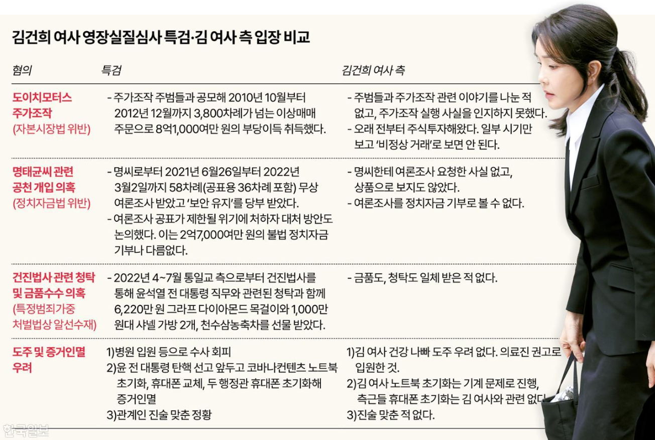 김 여사 측은 특검팀이 제시한 범죄 혐의를 모두 부인했지만 정 부장판사 판단은 달랐다. 김 여사 측 최지우·채명성·유정화 변호사는 △김 여사는 단순 투자자일 뿐 도이치모터스 주가조작 사실을 인지하지 못했고 △명씨에게 여론조사를 요청한 사실이 없고 '무상 여론조사'를 금액으로 산정해 정치자금법 위반 혐의를 적용하는 것은 부당하며 △건진법사로부터 청탁이나 금품을 받은 적이 없다고 반박했다. 김 여사의 진단서를 제출하며 건강이 좋지 않아 도주할 우려가 없다는 점도 강조했지만, 정 부장판사는 받아들이지 않았다.