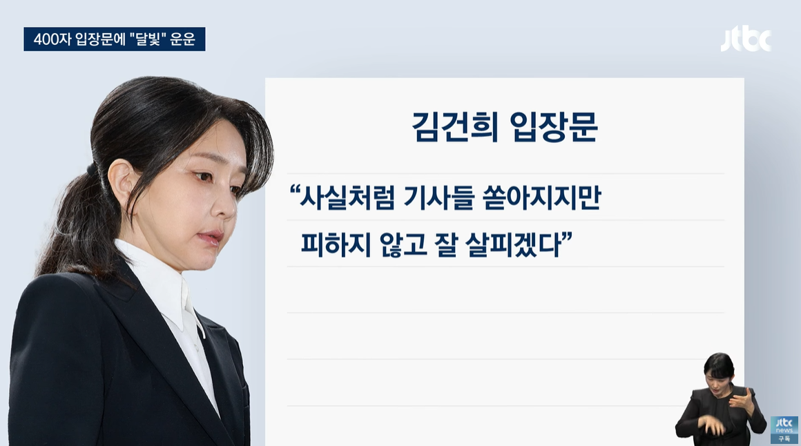 "확정적 사실처럼 매일 새로운 기사들이 쏟아지고 있지만 피하지 않고 잘 살피겠다"는 언급 특검과 언론들이 김건희를 공격하지만, 그것은 '기사'일 뿐, 법의 판단은 아니고, 법정에서 돈주고 변호사 고용해서 싸우겠다는 식이다.
