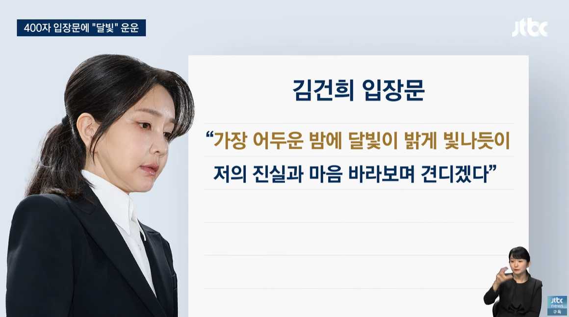 "(김건희) 가장 어두운 밤에 달빛이 밝게 빛나듯이 저의 진실과 마음을 바라보며 이 시간을 견디겠다"