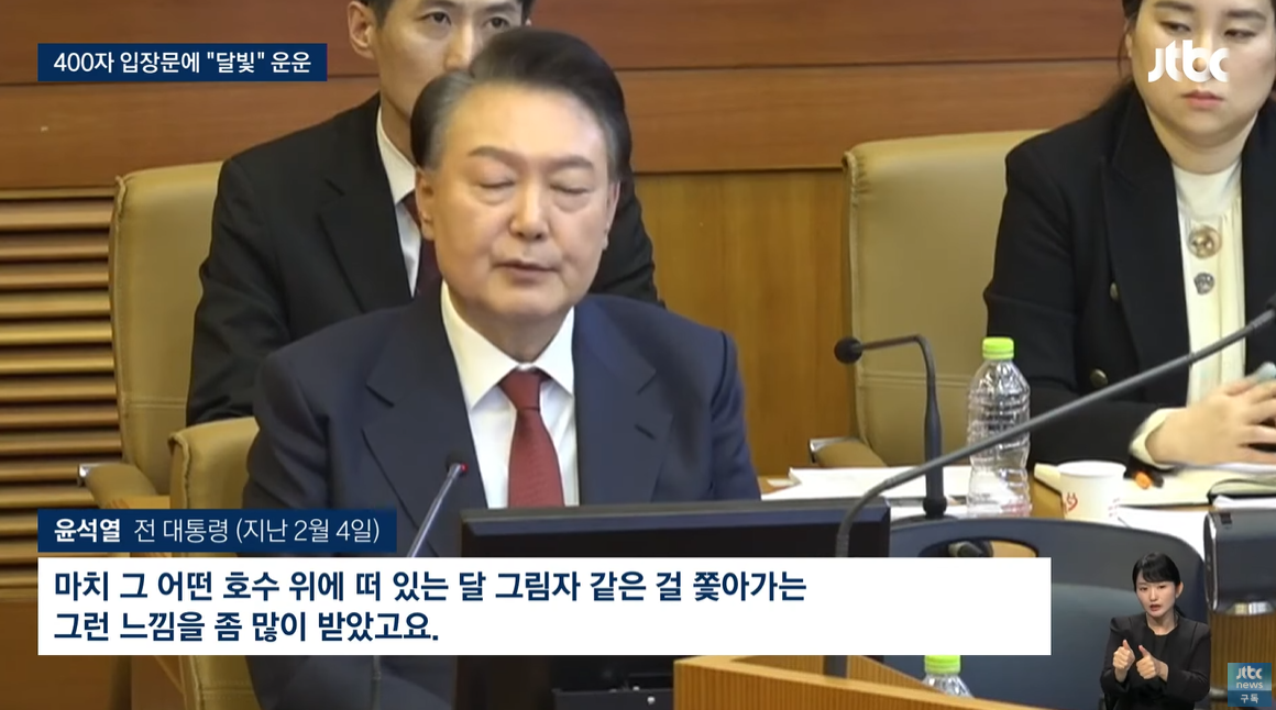 김건희 씨는 짧은 입장문을 내놨습니다. 자신의 처지를 '어두운 밤의 달빛'에 비유하며 현실을 부정하는 듯했습니다. 윤 전 대통령의 '호수 위 달그림자'를 연상시키는 발언도 있었습니다.