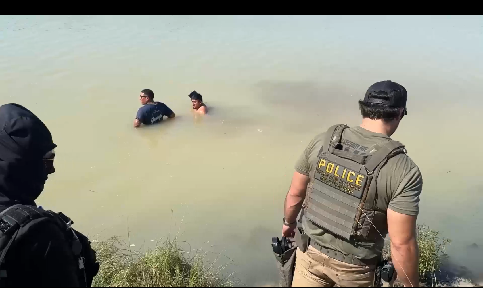 건설 현장 노동자들 중에, 라틴 아메리카에서 온 사람들로 보이는 노동자들이 물 속으로 도망갔다. 그들은 체포되었다.