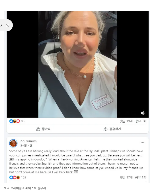 토리 브레이넘 페이스북 갈무리(왼쪽). 4일(현지시각) 복면을 착용한 미 국토안보부 소속 경찰이 권총과 방탄복, 수갑을 찬 채로 미국 조지아주 엘라벨에 있는 현대차그룹-엘지에너지솔루션 공장에서 단속을 벌이고 있는 모습(오른쪽).