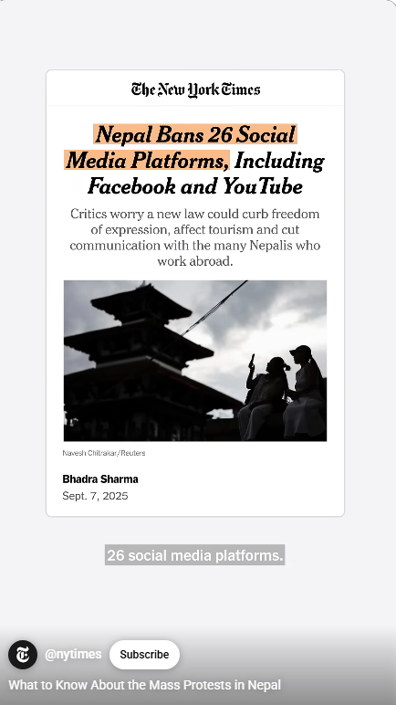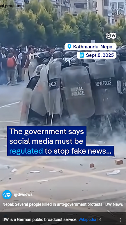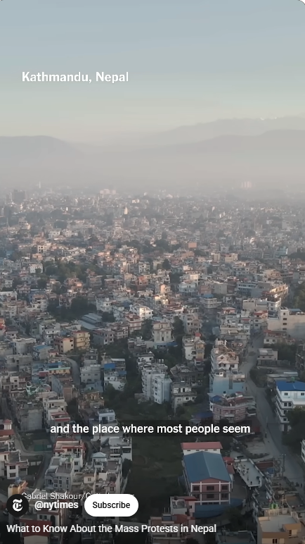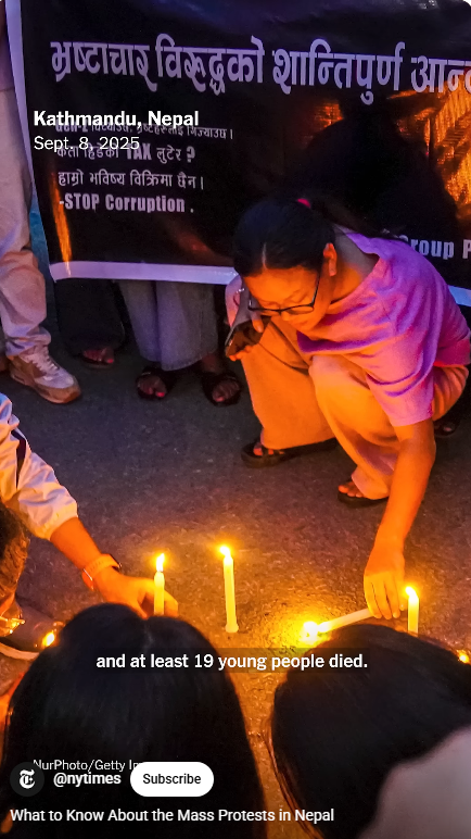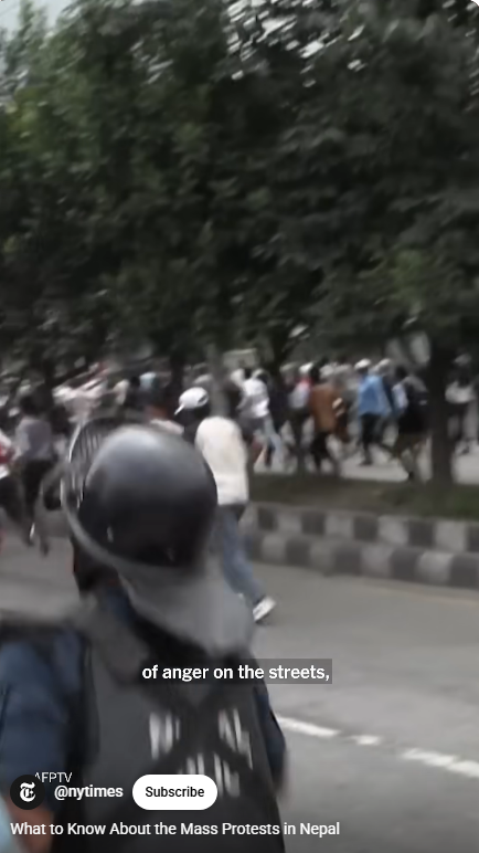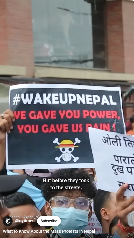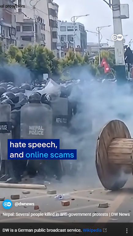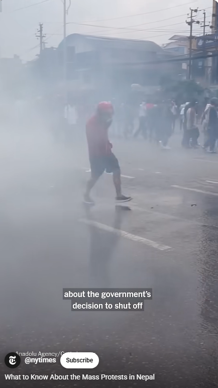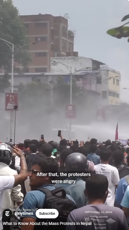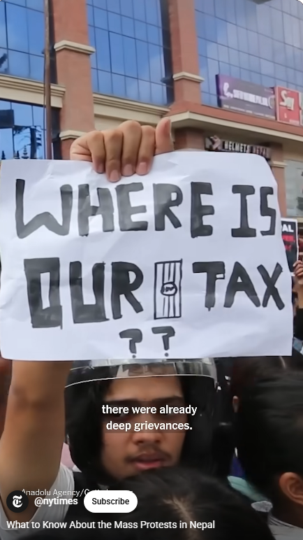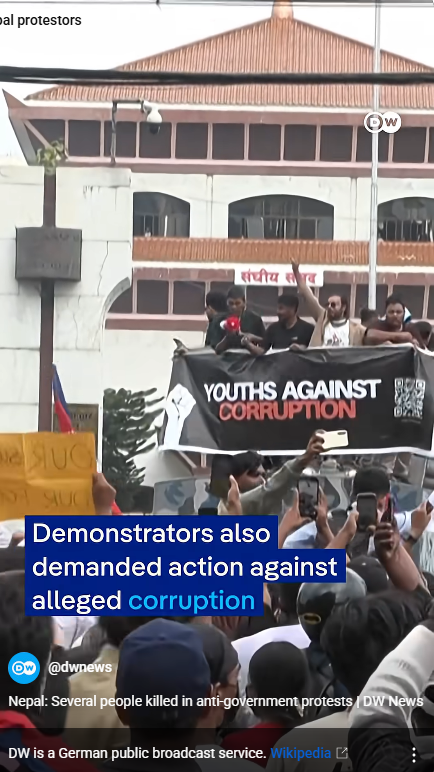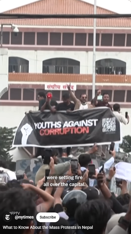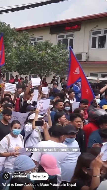 이것과 더불어, 세금을 착복해 부정부패를 저지르는 탐욕 정치인들에 대한 네팔인들의 불만이 터졌다. 부정부패 추방운동을 벌이는 장소가 소셜 미디어, 틱톡, 인스타그램,페이스북이다. 그런데 2주 전에 샤마 올리(Oli) 총리가 26개 소셜 미디어의 사용을 금지하고 탄압했다.