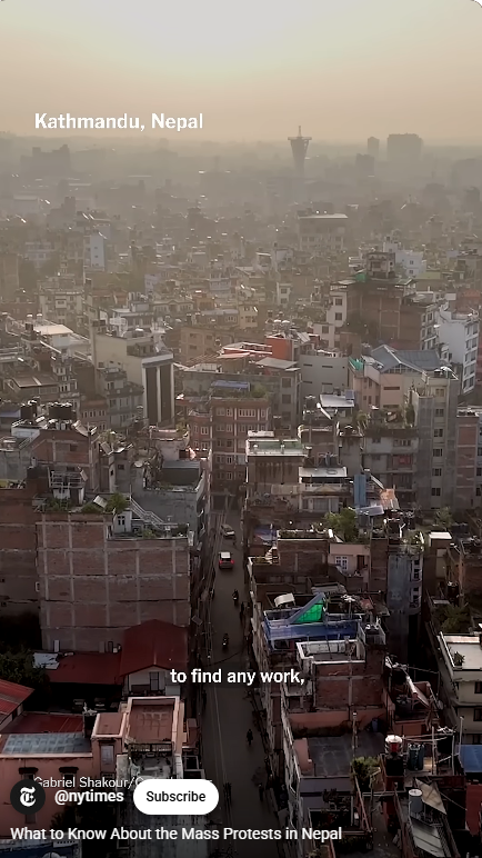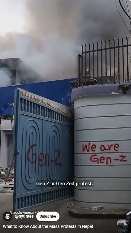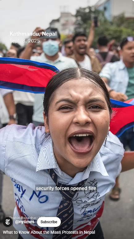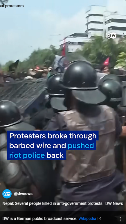 9월 8일 Z 세대 네팔 청년들 카트만두에서 시위 시작됨, 카트만두, 포카라, 이타하리 등 네팔 주요도시 대학생들과 10대 학생들까지 동참. 시위대가 의회와 관공서 담을 넘을 때, 경찰과 충돌 200여명 부상당할 정도로 시위가 과격해짐.