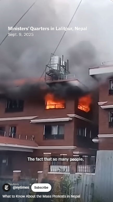 On Tuesday, protesters also set fire to parliament in the capital Kathmandu, sending thick black smoke billowing into the sky. Government buildings and the houses of political leaders were attacked around the country.