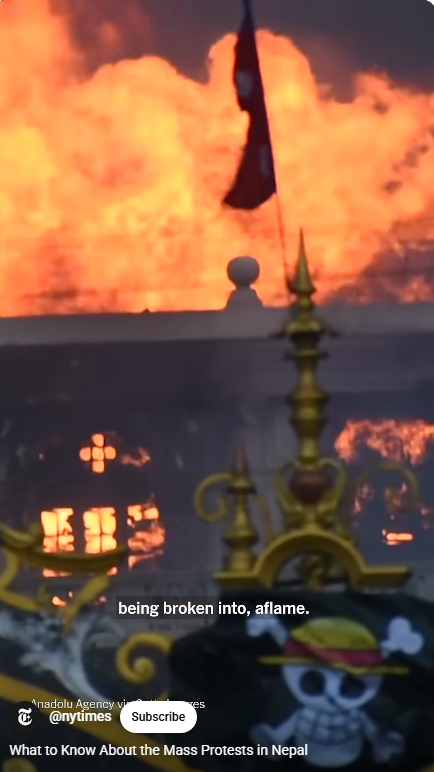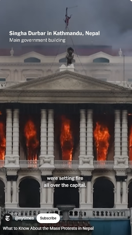 9월 9일 화요일. 시위대 의회 건물과, '네팔 의회당(NCP)', 네팔 전 총리 '셔 데우바(Deuba)' 집에 방화 시작. 몇 정치인들의 주택이 공격당함.