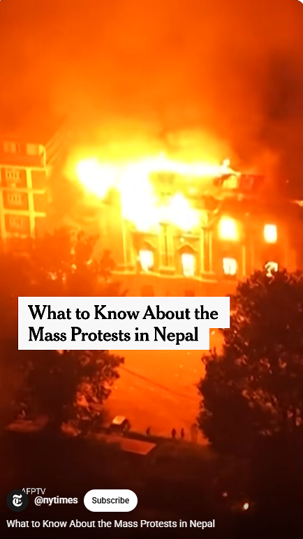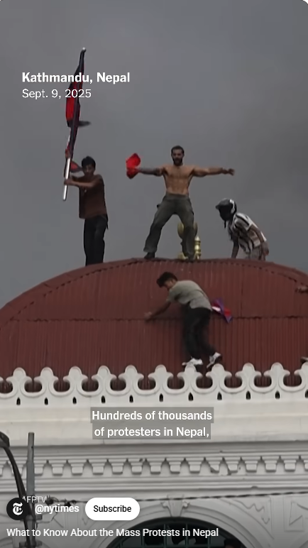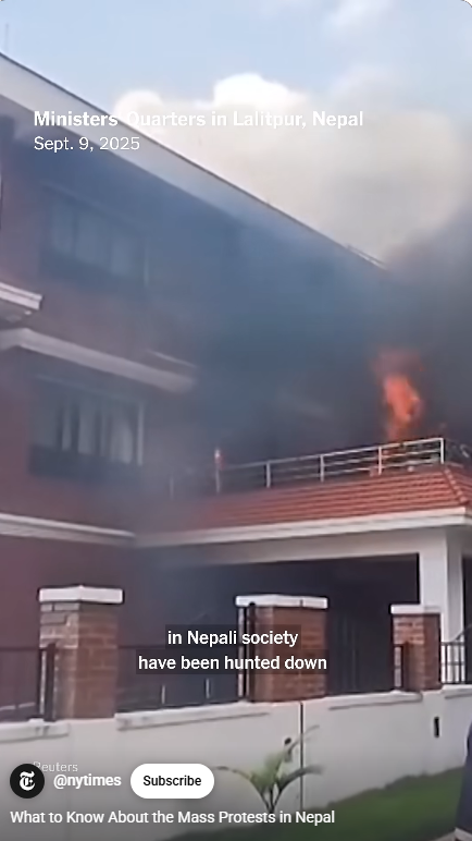 1.네팔 Z 청년들은 왜 의회와 정치인들의 집을 불태웠는가? 그 이면에는 화해불가능한 사회적 불평등이 있었다. 네팔 청년들은 고위직 관료, 정치인, 족벌 기업인의 자녀들의 호화로운 삶을 담은 동영상을 틱톡, 인스타그램에 게시했다. 이들을 가리켜 ‘족벌 아이들, 네포 키즈 Nepo Kids/Babies’라고 조롱했다. 네팔 청년들은 실업으로 고통받고 있고, 한국을 비롯 다른 나라에 일자리를 찾으러 강제이민을 가고 있는 상황에서, ‘네포 키즈’의 호화사치로운 생활은 10대 청년들의 분노를 자아냈다.