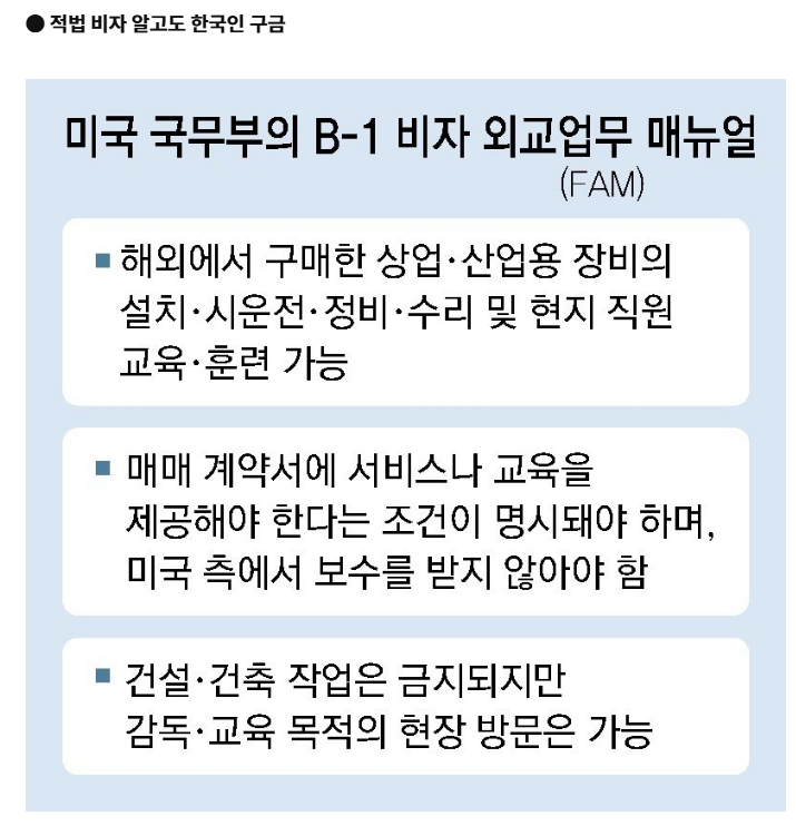 비자 업무를 총괄하는 미 국무부의 외교업무매뉴얼(FAM)에 따르면 B1 비자 소지자는 해외에서 제작·구매한 장비를 설치·시운전하거나, 현지 직원을 대상으로 교육·훈련을 실시할 수 있다. 건축 또는 건설 업무를 감독하거나 교육하는 것도 가능하다. 다만 미국 내에서 직접 보수를 받아선 안 된다. 국무부 매뉴얼에 따르면 B1 비자를 소지하고 현지 공장 건설 현장에 있었다는 이유만으로는 이민당국이 불법 체류자로 규정하기 어려운 셈이다.