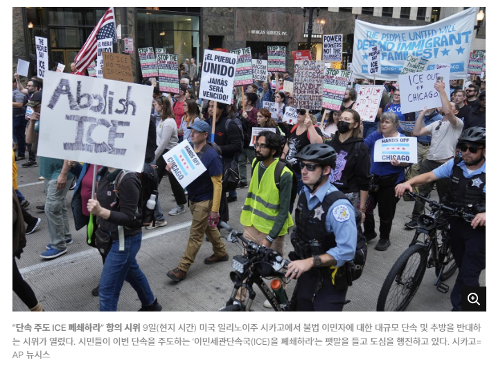“단속 주도 ICE 폐쇄하라” 항의 시위 9일(현지 시간) 미국 일리노이주 시카고에서 불법 이민자에 대한 대규모 단속 및 추방을 반대하는 시위가 열렸다. 시민들이 이번 단속을 주도하는 ‘이민세관단속국(ICE)을 폐쇄하라’는 팻말을 들고 도심을 행진하고 있다. 시카고=AP 뉴시스