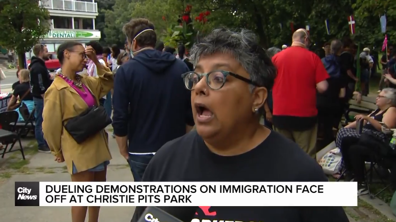 “We’re here to basically say that racists aren’t welcome in our park and in our community, and actually in any community. We don’t believe that immigrants are to blame for the economic crisis that a lot of people are experiencing,” said Deena Ladd, executive director of Workers Action Centre.