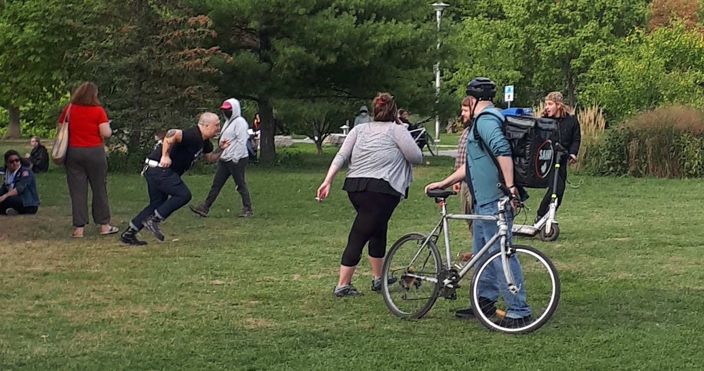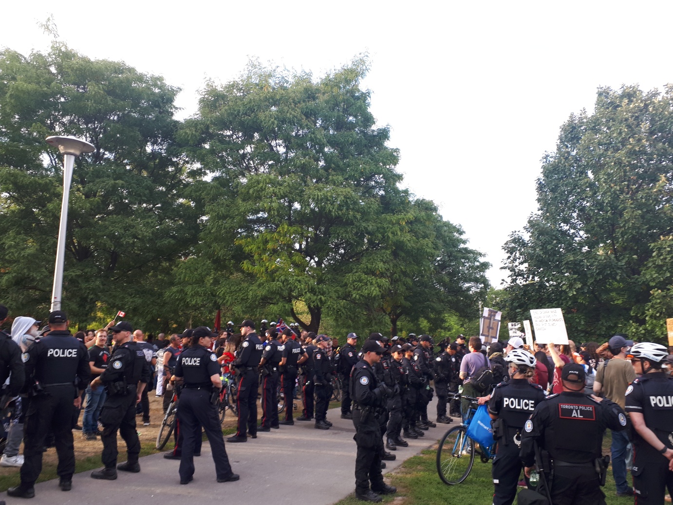“캐나다 퍼스트” 참여자들이 공원에서 집회를 못하게 되자, 바로 옆 블루어 길거리로 도망가서 길거리 행진을 하자, 경찰들이 이들을 안전선 안에 가두고 행진하도록 함.