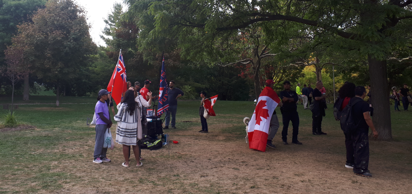 The Canada First Rally was originally planned at the site. It drew a counter demonstration dubbed “No to Hate, Yes to Immigrants!”