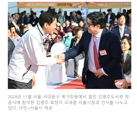 2024년 11월 서울 서대문구 북가좌동에서 열린 김병주도서관 착공식에 참석한 김병주 회장이 오세훈 서울시장과 인사를 나누고 있다. 사진=서울시 제공