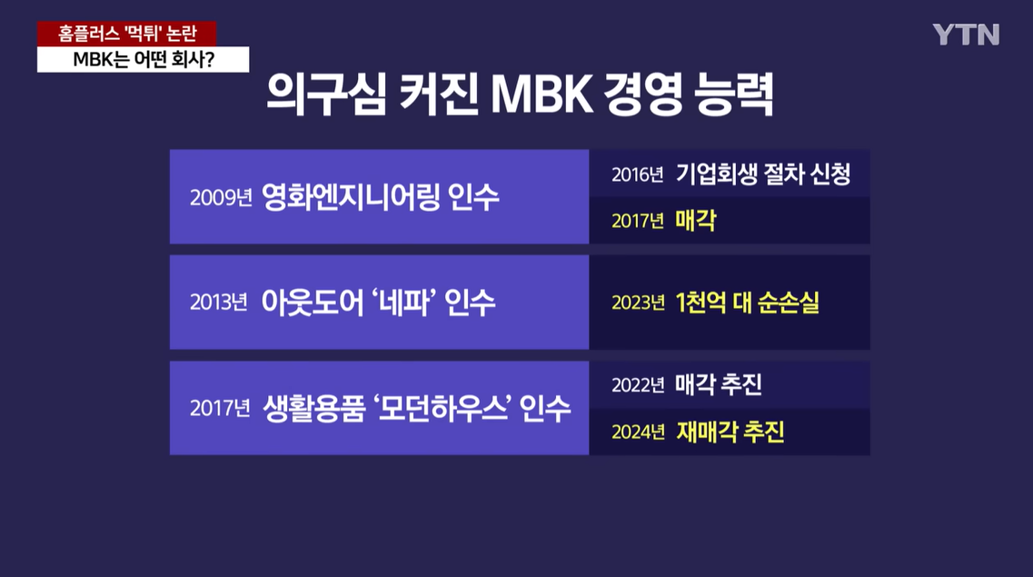 홈플러스 사태를 계기로 MBK의 경영 능력에 물음표가 그려졌습니다.