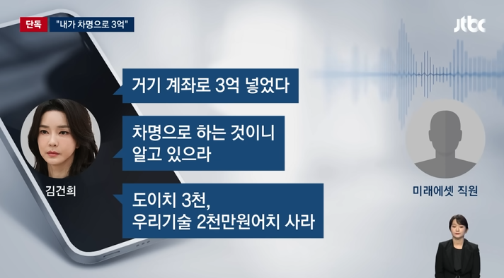 2011년 8월, 김건희가 미래에셋에 전화해, 차명계좌로 3억원을 입금해, 주식을 구매.