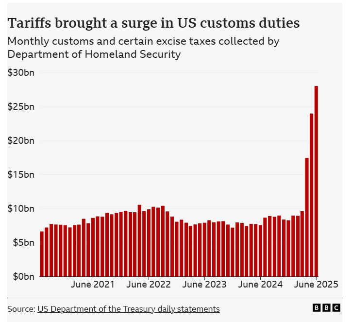 Tariffs that have increased from an average of 2% at the beginning of the year to around 17% now have had a notable impact on US government revenue – one of the stated goals of Trump's trade policy. Import duties have brought in more than $100bn so far this year - about 5% of US federal revenue, compared to around 2% in past years.