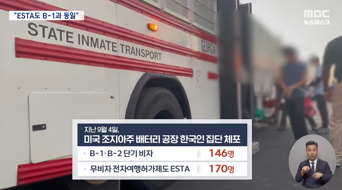 미국 조지아주 배터리공장에서 체포된 한국인 317명 중 146명은 B-1·B-2 단기 비자를, 170명은 무비자 전자여행허가제도인 'ESTA'를 갖고 있었습니다.
