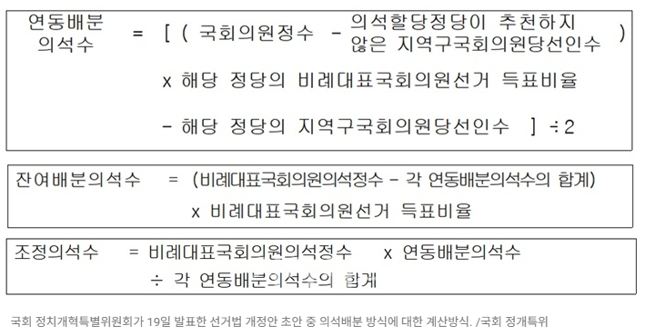 다만 실제로 비례대표 의석 배분과정에 이보다 복잡한 계산식이 적용된다.