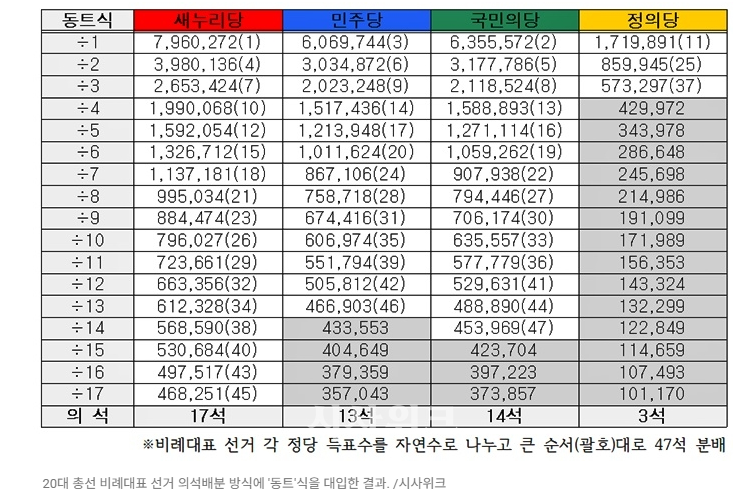 20대 총선 비례대표 선거 의석배분 방식에 '동트'식을 대입한 결과. /시사위크