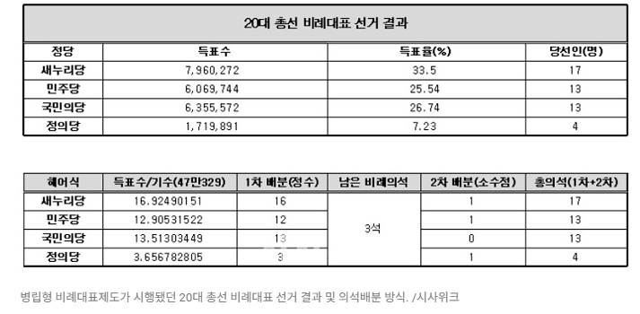 병립형 비례대표제도가 시행됐던 20대 총선 비례대표 선거 결과 및 의석배분 방식. /시사위크