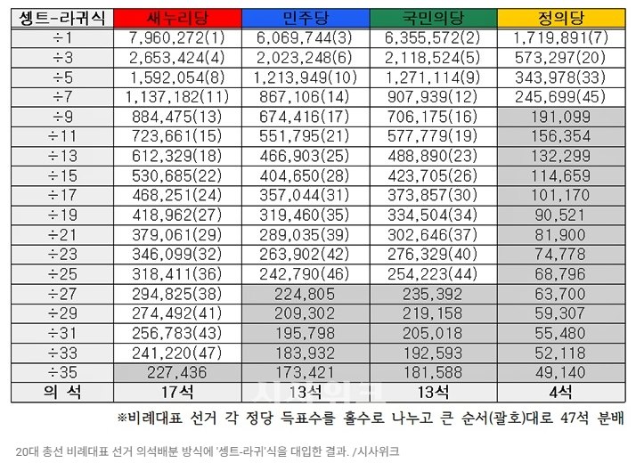 20대 총선 비례대표 선거 의석배분 방식에 '셍트-라귀'식을 대입한 결과. /시사위크