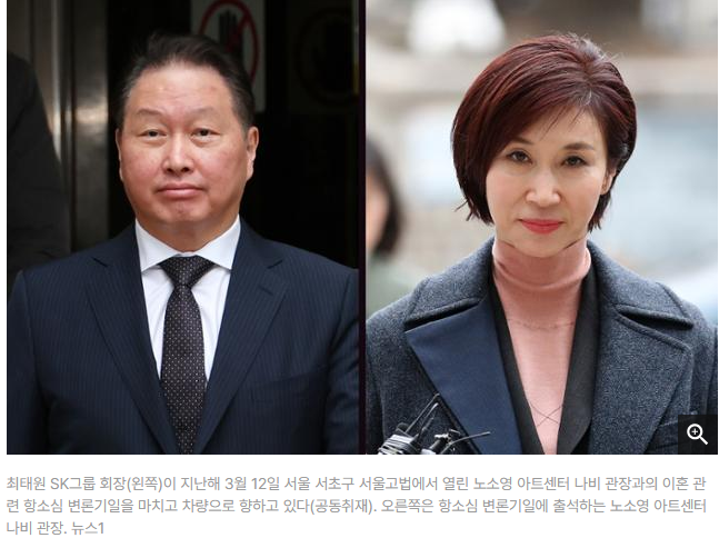 ③역대 최대 규모로 알려진 위자료 청구는 그대로 확정됐다. 앞서 1심을 맡은 서울가정법원은 통상의 관례에 따라 노 관장의 청구액 3억 원 중 1억 원을 인용했다. 항소심은 반면 "재산 상태와 경제 규모 등 여러 사정을 종합해야 한다"며 노 관장이 증액 청구한 30억 원 중 20억 원을 인용했다.
