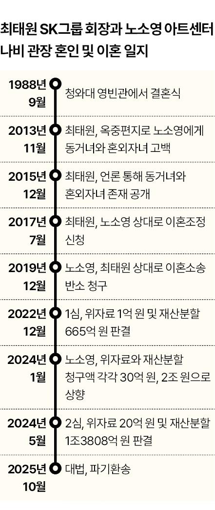 이날 판결로 2017년 7월 본격화한 '세기의 이혼소송'은 한 번 더 법원 판단을 받게 됐다. 1988년 노 관장과 결혼한 최 회장은 2015년 혼외 자녀 및 동거녀의 존재를 언론을 통해 드러내며 이혼을 예고했다. 노 관장은 이에 "가정을 지키겠다"며 합의를 거절했으나, 2019년 12월 맞소송을 냈다.