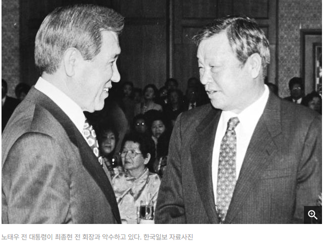 노태우 전 대통령이 최종현 전 회장과 악수하고 있다. 한국일보 자료사진