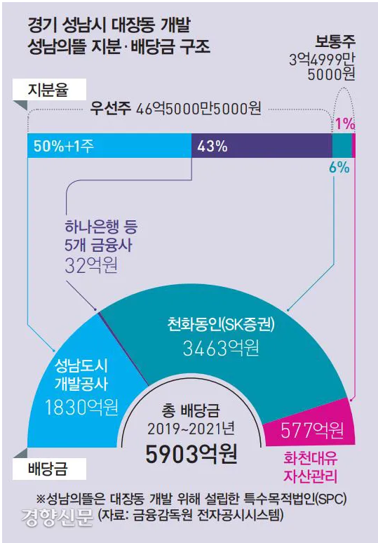 대장동 특혜 의혹은 화천대유와 천화동인으로 연결된 소수의 인물이 4040억원에 이르는 배당 수익을 거둔 사실이 알려지며 불거졌다. 화천대유는 자산관리회사로 성남의뜰 지분을 1% 갖고 있다. 천화동인 1~7호는 증권사를 통해 특정금전신탁(증권사에 돈을 맡기면서 투자처를 지정해 배당을 받는 방식)으로 성남의뜰에 참여(지분 6%)했던 개인투자자들이다. 이들은 화천대유 대주주 김만배씨 친인척이거나 동업자들인 것으로 확인됐다.
