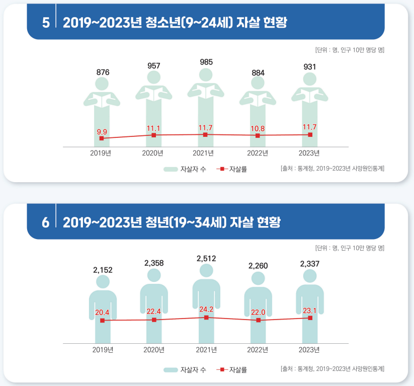 청소년(9~24세) 자살자 수는 931명(남자 500명, 여자 431명),