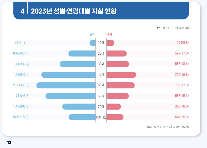 2023년 연령대별 자살 현황을 살펴보면 자살자 수는 50대(2,792명, 20.0%), 40대(2,510명,