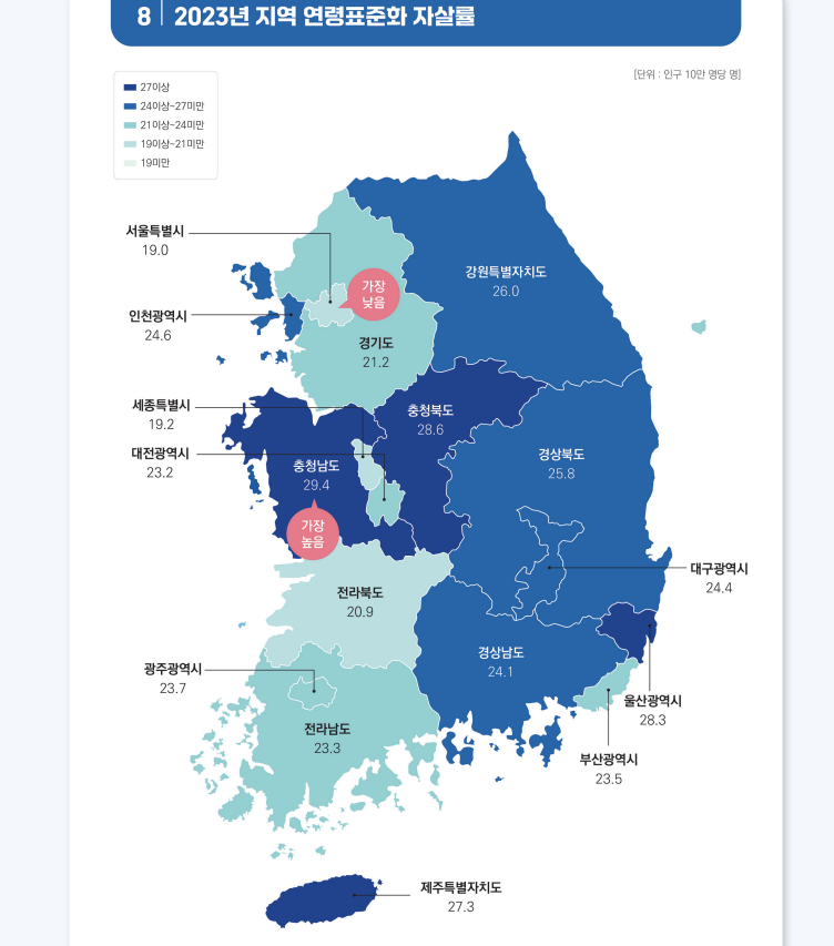 연령표준화 자살률은 충청남도가 29.4명으로 가장