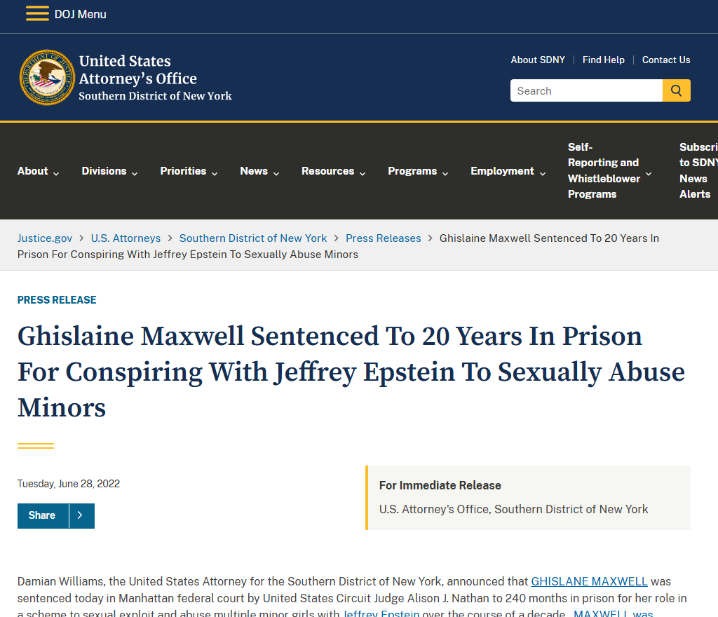 Damian Williams, the United States Attorney for the Southern District of New York, announced that GHISLANE MAXWELL was sentenced today in Manhattan federal court by United States Circuit Judge Alison J. Nathan to 240 months in prison for her role in a scheme to sexual exploit and abuse multiple minor girls with Jeffrey Epstein over the course of a decade.
