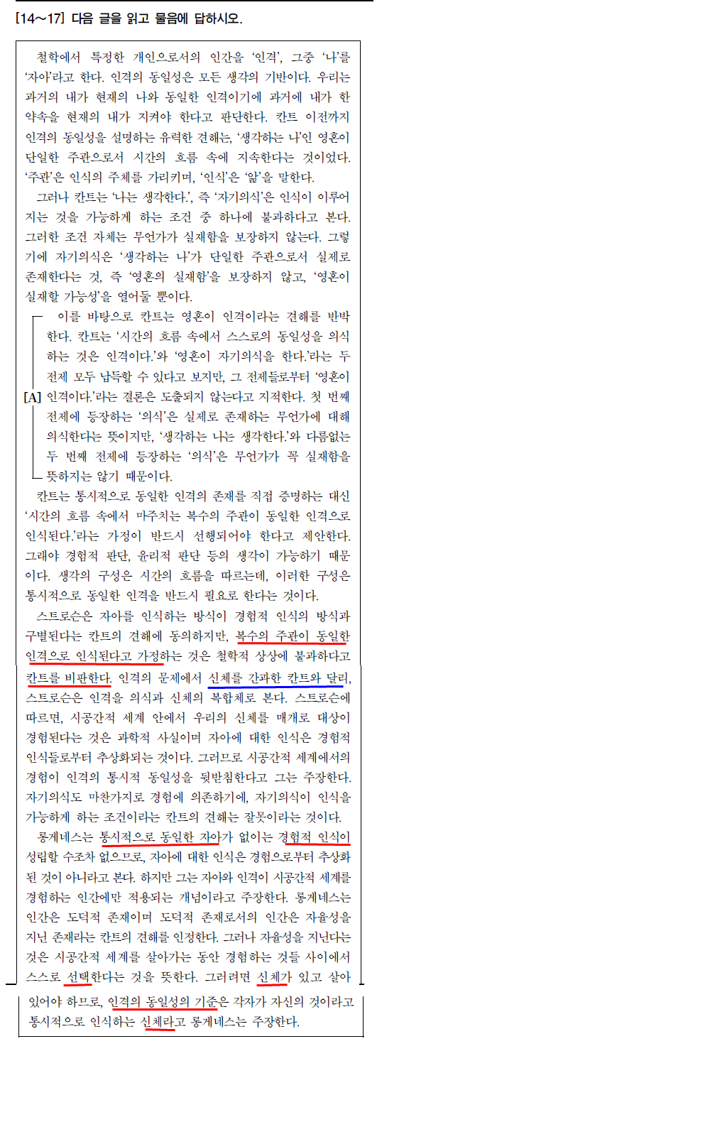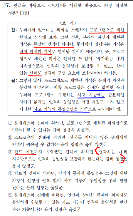 갑의 입장은 칸트 이전 주류 견해와 다름. (생각하는 나의 지속만으로는 인격의 동일성이 보장된다는 입장이 칸트 이전 주류 견해)이고, 갑의 입장은 ‘생각하는 나의 지속만으로는 인격의 동일성이 보장될 수 없고, 살아있는 신체도 인격의 구성요소에 포함시켜야 한다’ 따라서 칸트 이전 주류 견해와 ‘갑의 입장’은 서로 상반된다.