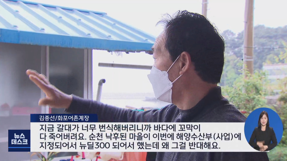 "지금 갈대가 너무 번식해버리니까 바다에 꼬막이 다 죽어버려요. 순천 낙후된 마을이 이번에 해양수산부(사업)에 지정되어서 뉴딜300 되어서 했는데 왜 그걸 반대해요."