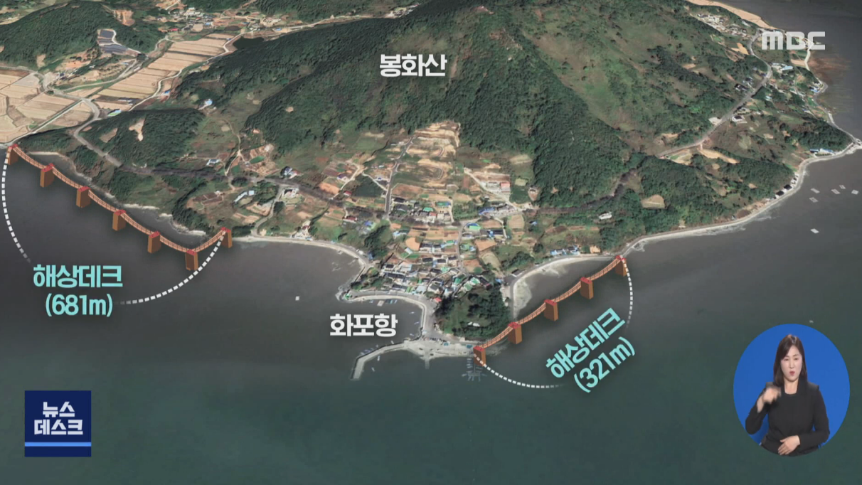 (화포항 오른쪽 해상데크 321 m, 왼쪽 해상데크 681m) 화포항 뒷쪽 산은 봉화산.